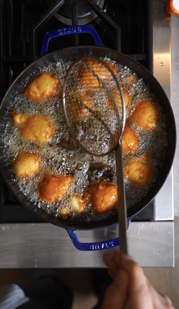 Scoop and fry: Using a 4-ounce portion scoop, I drop the batter directly into the oil. The donuts fry for about 3–4 minutes, turning as needed, until golden, puffed, and crisp.