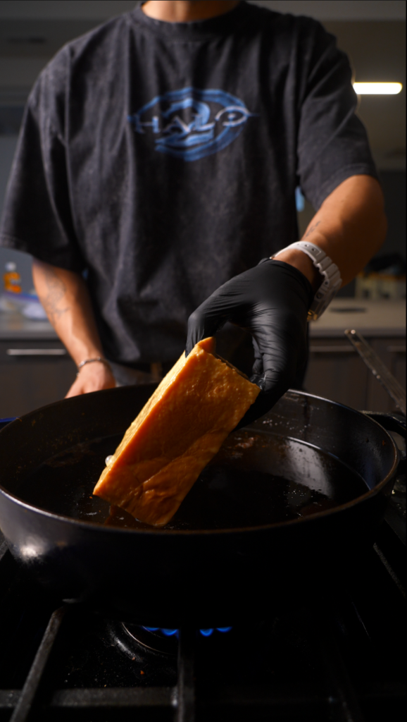 Fry in neutral oil at 350°F. While it fries, keep basting the top so it cooks evenly and builds that crust. Flip once golden and finish until deep golden brown all around.