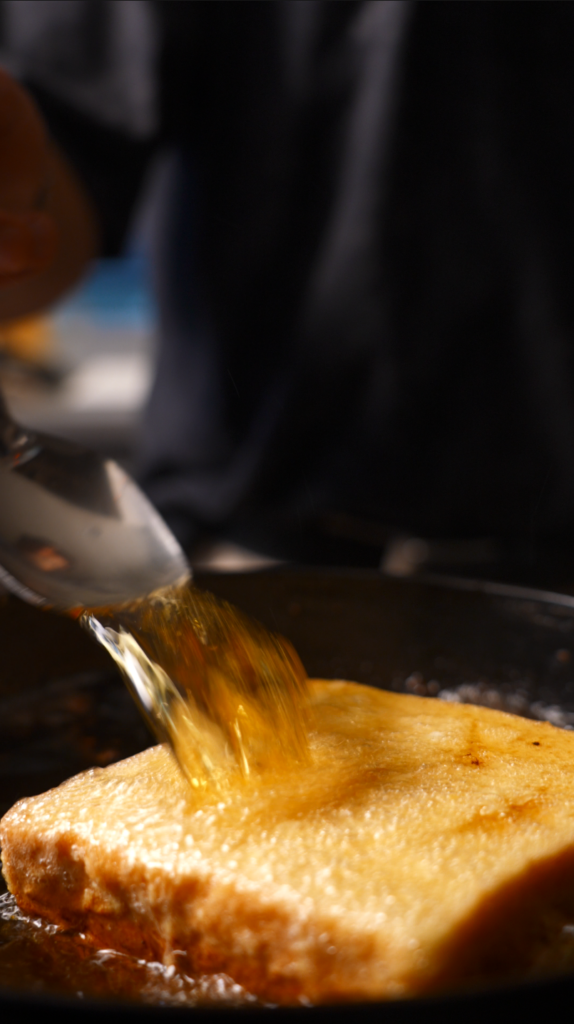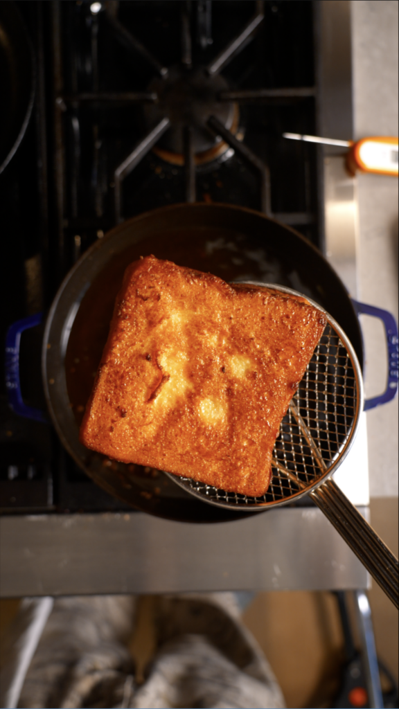 - Heat neutral oil to 350°F in a pan and carefully add the soaked bread.
