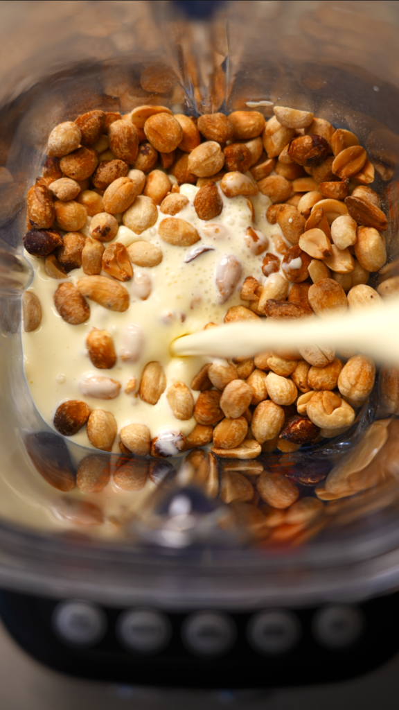 Roast the peanuts, then while they’re still hot, add them straight into a blender. Blend them first so they start breaking down.