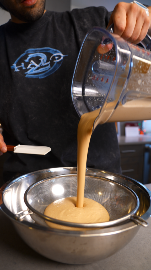 - Strain the peanut mixture into a bowl, then gently fold in mascarpone and powdered sugar until smooth, thick, and airy. Set aside.