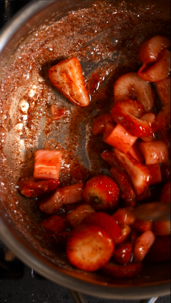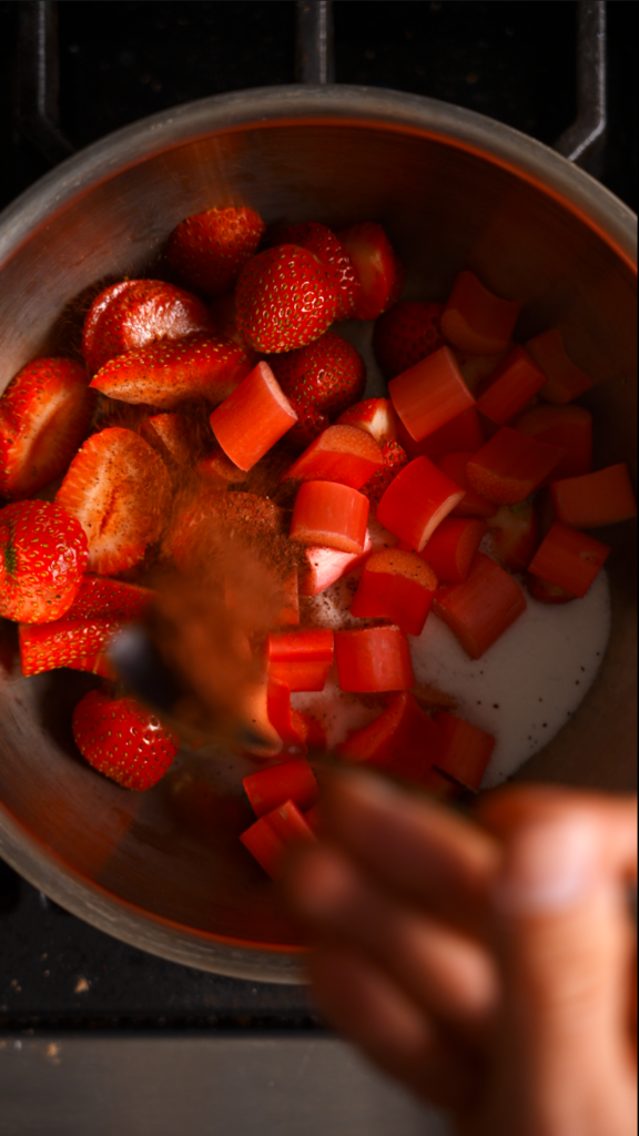- Add strawberries, rhubarb, sugar, and sumac to a pot and cook over medium heat without adding liquid.