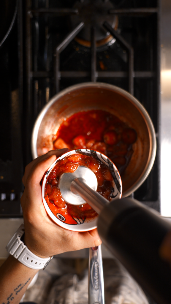 - Remove about half a cup of the mixture, blend until smooth, then return it to the pot and continue cooking until the compote thickens to a loose jam consistency.