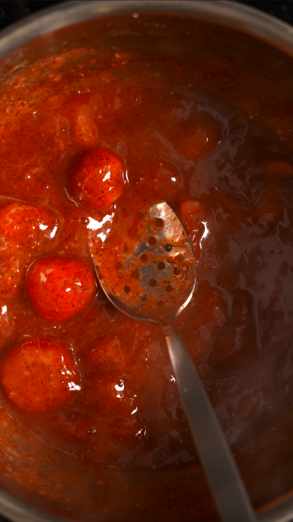 - As the mixture heats, crush the strawberries to release their juices and bring everything to a simmer.