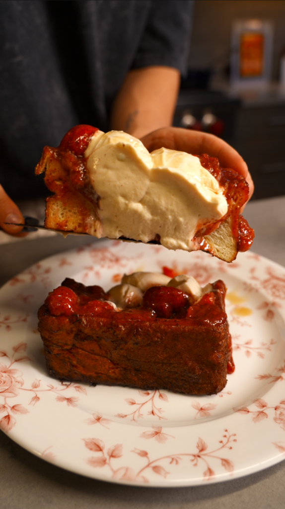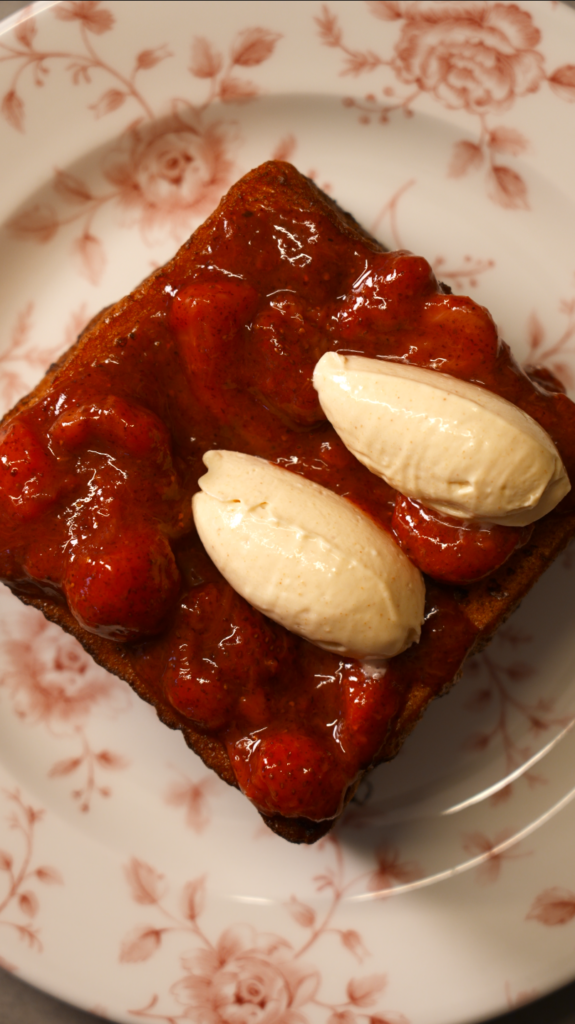 - To assemble, place the French toast on a plate, spoon the strawberry rhubarb compote over the top, and add quenelles or dollops of the peanut mascarpone cream.