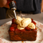Lay down your French toast, spoon over the compote, then hit it with quenelles of the peanut cream.