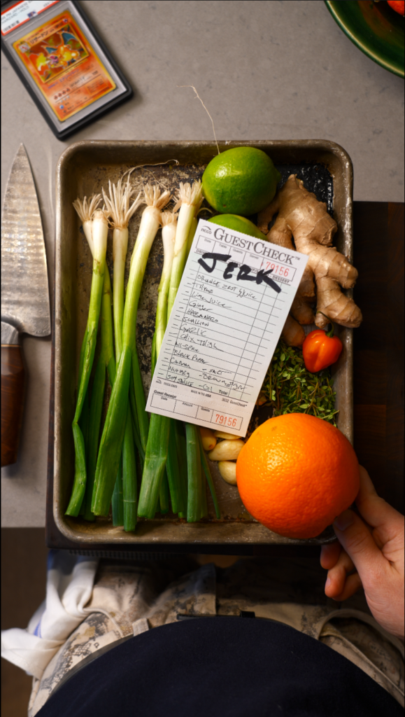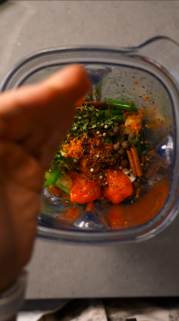 • Make the Jerk Marinade. Add the orange zest, thyme, lime juice, ginger, habaneros, scallions, garlic, allspice berries, peppercorns, nutmeg, cinnamon stick, soy sauce, brown sugar, salt, and neutral oil to a blender. Blend until mostly smooth but still slightly textured.