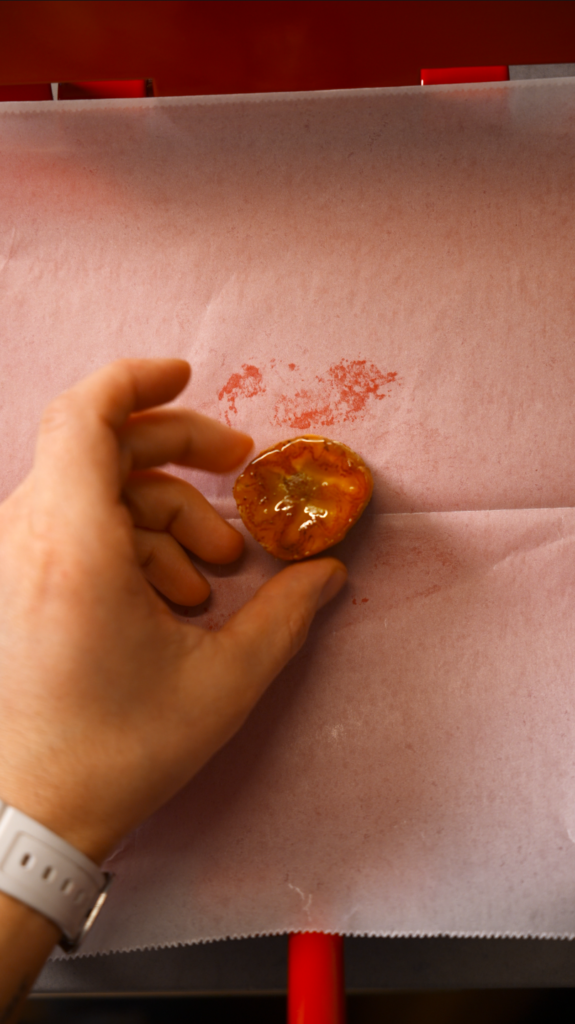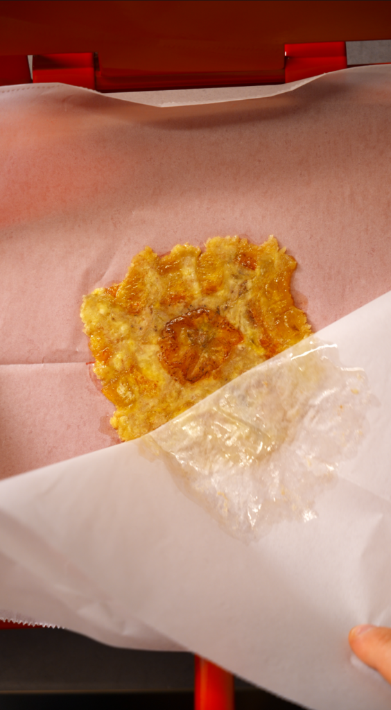Remove and place them between parchment paper in a tortilla press. Smash them flat.