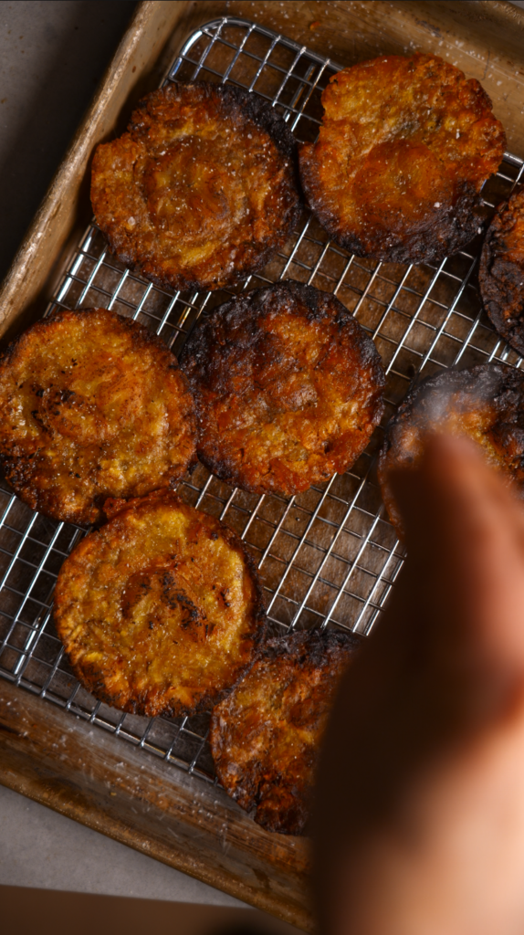 • Heat oil to 350°F and fry the plantain discs until golden brown and crispy.