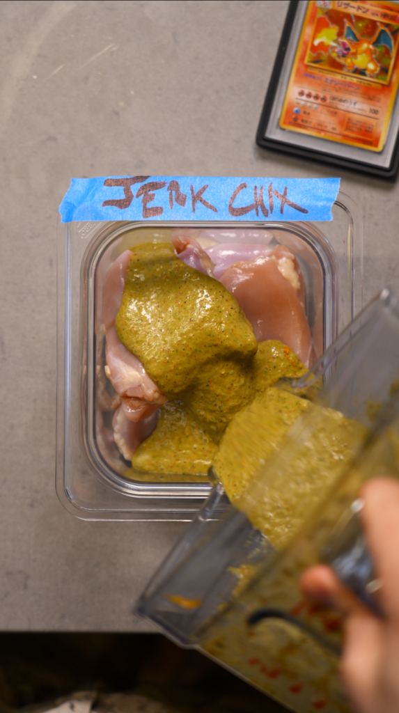• Cook the Jerk Chicken. Heat a cast iron skillet over medium-high heat and add a thin layer of neutral oil. Sear the chicken thighs until deeply charred on both sides.