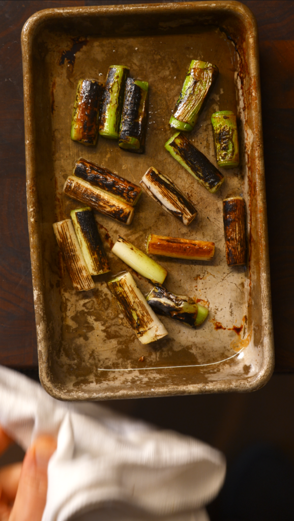 • Make the Green Scallion Salsa. Char the scallions under a broiler until lightly blackened. Add the charred scallions, cilantro, lemon juice, neutral oil, garlic, and salt to a container. Blend coarsely with an immersion blender until bright green but still slightly textured. Taste and adjust seasoning.