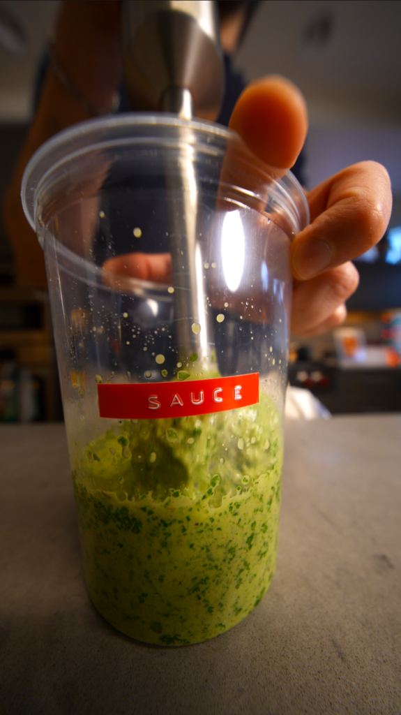 Add the scallions, cilantro, lemon juice, oil, garlic, and salt to a container. Blend coarsely with an immersion blender until bright green but still textured.