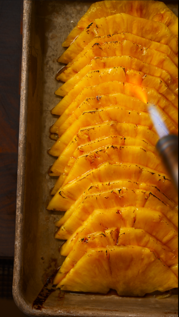 • Char the Soy Glazed Pineapple. Slice the pineapple thin and fan the slices out on a sheet tray. Mix the soy sauce and brown sugar and brush the mixture over the pineapple. Torch the pineapple until caramelized, or broil until lightly charred. Use the same ring mold to cut pineapple rounds that match the size of the plantain tostadas.