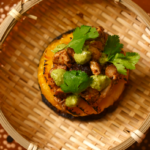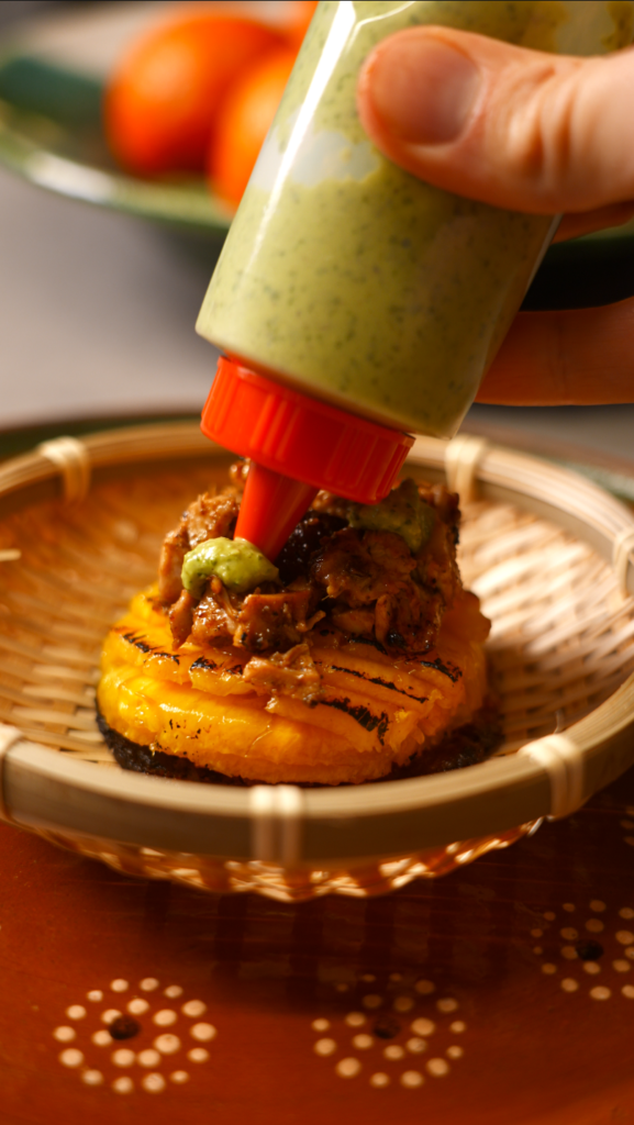 Instead of using a tortilla I built the base out of smashed fried plantains. The result is a crispy tostada shell that is naturally sweet and golden. On top of that goes charred pineapple, chopped jerk chicken, and a bright scallion and cilantro salsa.