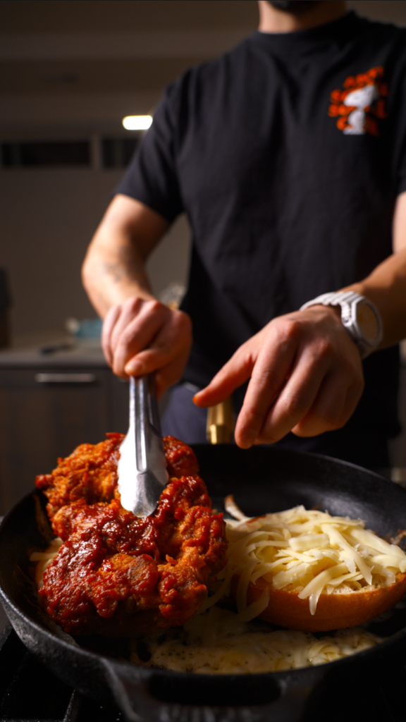 This is a pressed Korean fried chicken grilled cheese sandwich. It combines smashed chicken thighs, Nashville hot technique, gochujang glaze, crispy cheese crusted brioche, and a spicy Napa cabbage slaw. It is wide, crispy, cheesy, spicy, and built to be eaten without unhinging your jaw.
