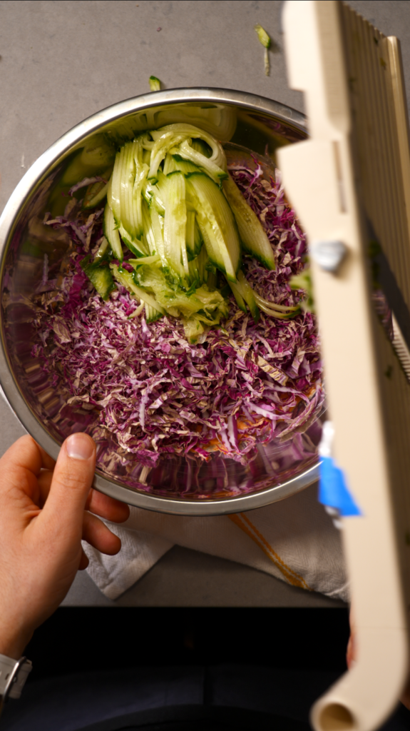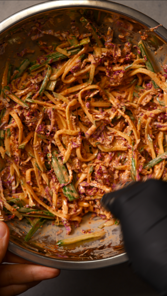 - In a large bowl, combine shaved Napa cabbage, scallions, and cucumber. In a separate bowl, mix Kewpie mayonnaise, sambal, and kimchi base. Fold the dressing into the vegetables and chill until ready to assemble.