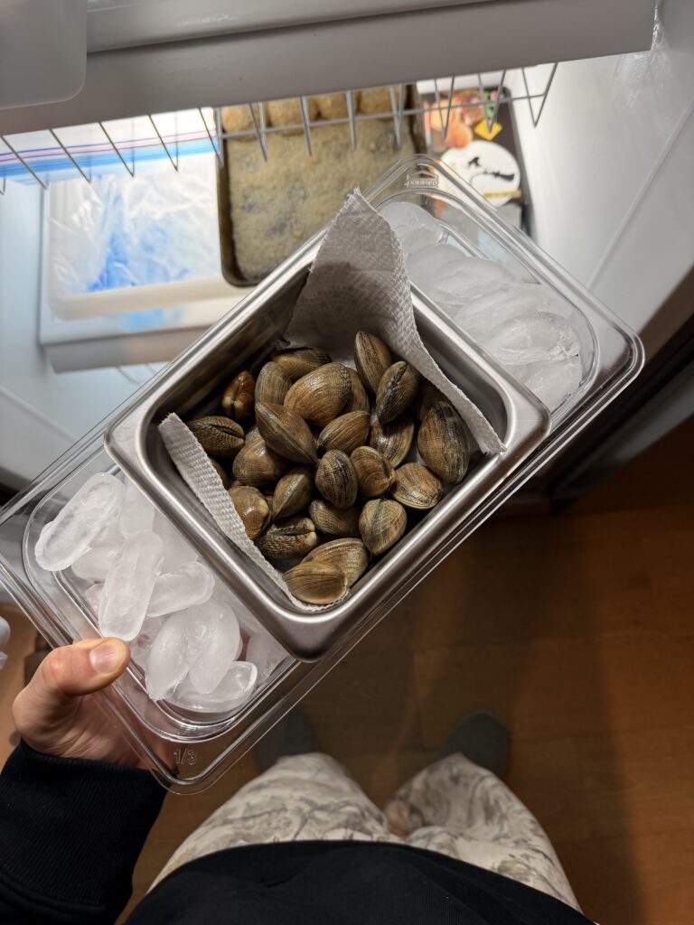 Manila clams stored uncovered over ice in a metal container in the refrigerator.