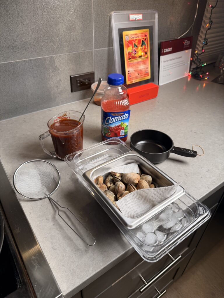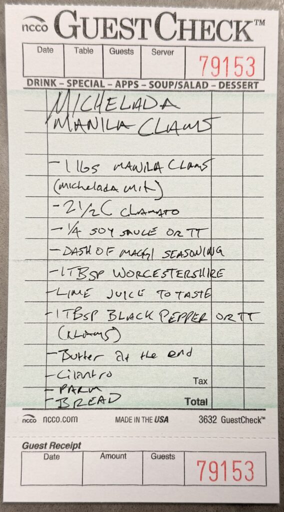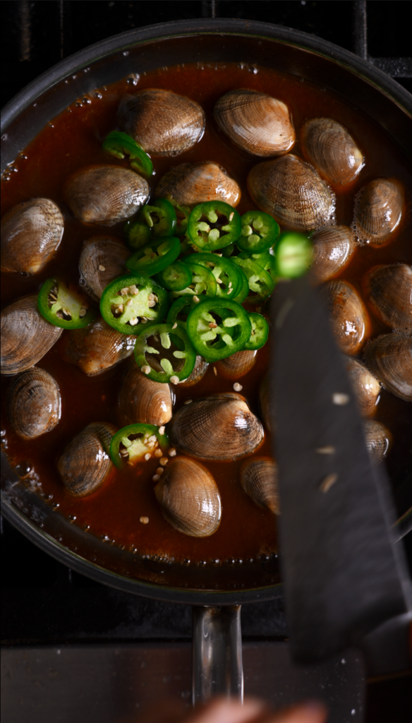 This dish is my take on michelada clams using Manila clams. It pulls from a few different places in my life. Years of cooking clams over live fire at Palace Kitchen in Seattle. Growing up in South Texas drinking clamato preparado from raspa stands outside of school. And now cooking at home with access to some of the best shellfish in the country.