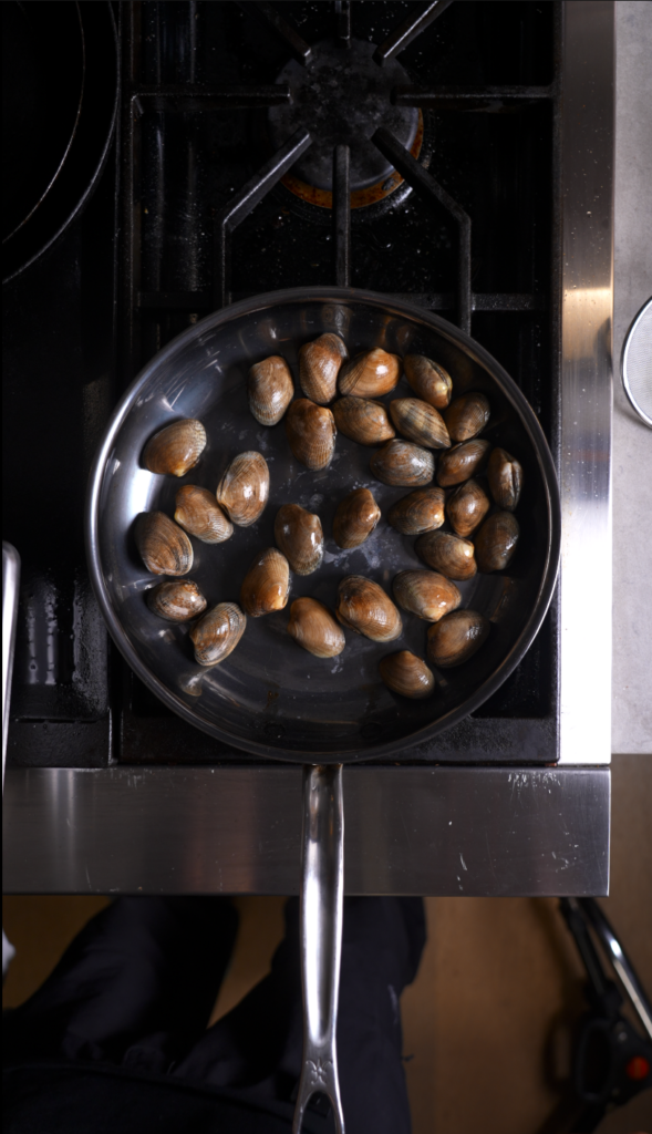 Toss the entire pan into a hot oven and let the clams roast until they open. This step is inspired directly by restaurant cooking. At Palace Kitchen, we used to throw clams straight onto hot wood fire coals. The shells would blister, the liquid would reduce, and everything would taste deeper and more complex.