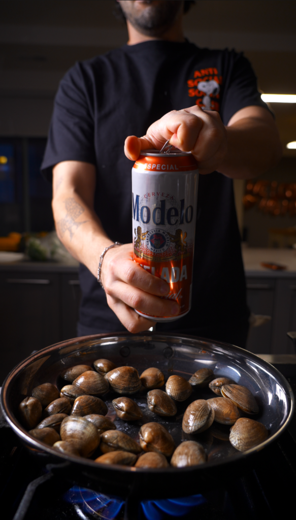 - Heat a wide skillet over medium-high. Add clams and pour in beer (Modelo works well).
