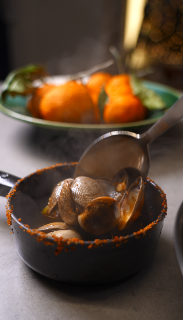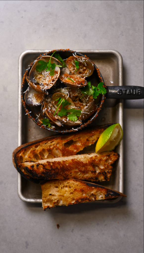 - Rim a skillet with lime and tajín. Add clams and broth, then finish with cilantro and freshly grated Parmesan. Serve with butter-toasted sourdough for dipping.