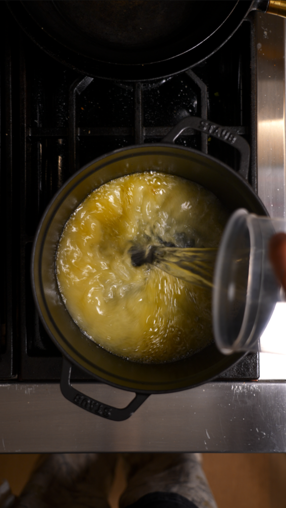 - Make the Choux Dough. In a saucepan, melt butter. Add water, salt, and ground pizza; whisk to combine.
