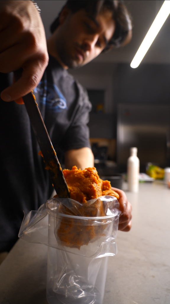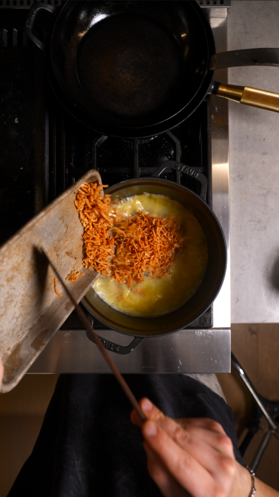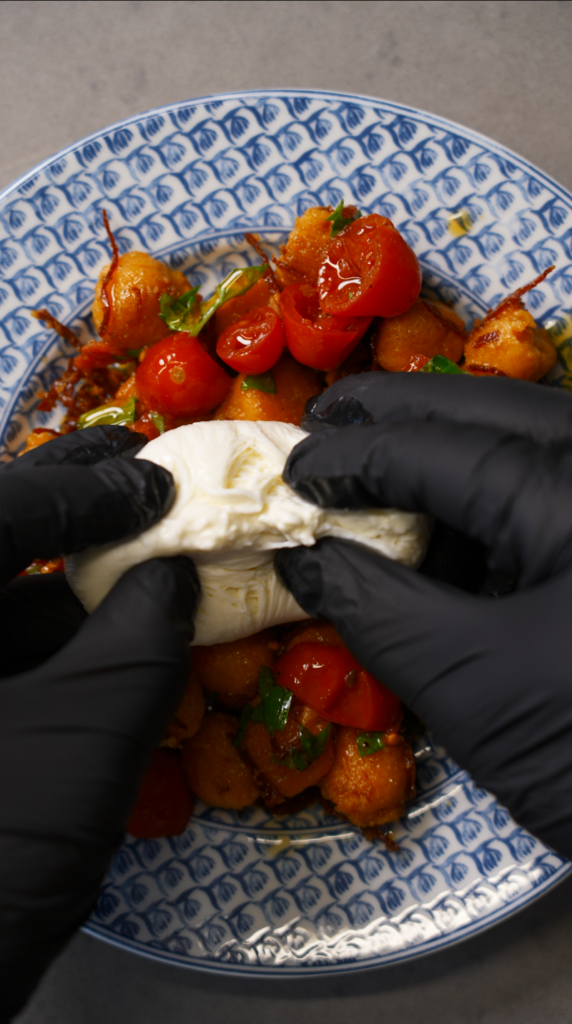 This is classic pâte à choux style Parisian gnocchi. But with the flour reduced and replaced with finely ground pizza. It is crispy on the outside, tender inside, and tastes like pizza without being gimmicky.