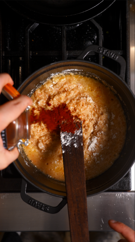 - Stir in flour and cook over medium heat, stirring aggressively, until a smooth paste forms and pulls away from the sides. Mix in paprika.