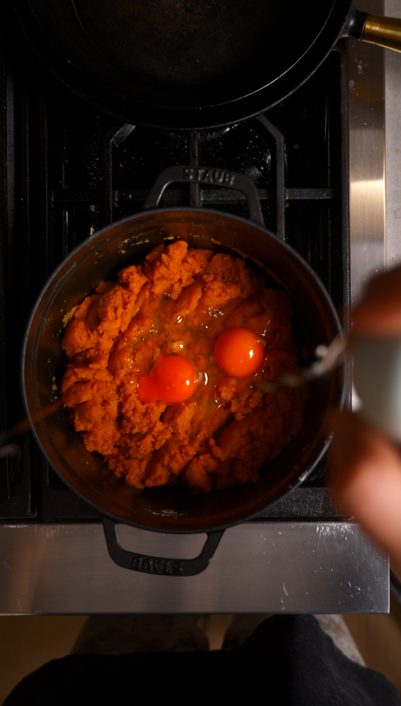 - Remove from heat and add eggs one at a time, mixing vigorously after each addition until glossy and smooth. Transfer dough to a piping bag.