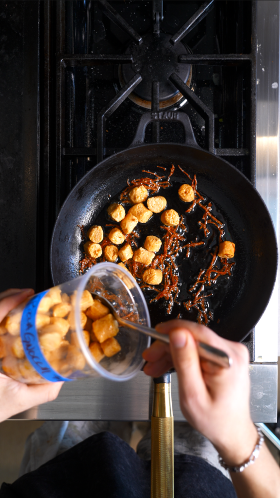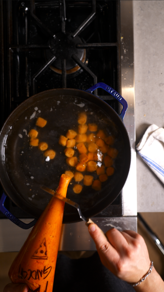 - Add cooked gnocchi and sauté until deeply golden and crispy. Season with salt.