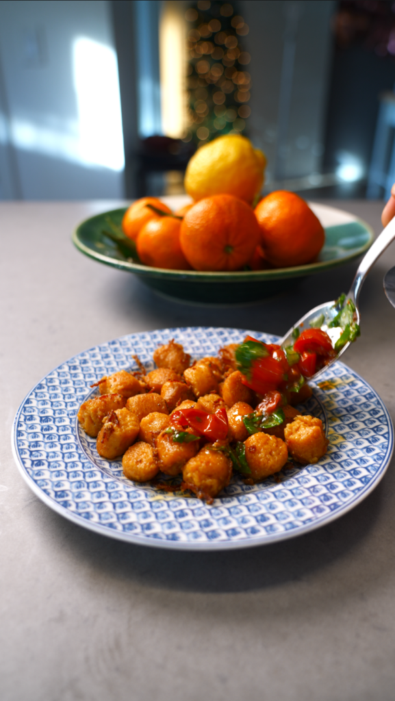 - Finish and Serve. Spoon the tomato basil mixture over hot crispy gnocchi.