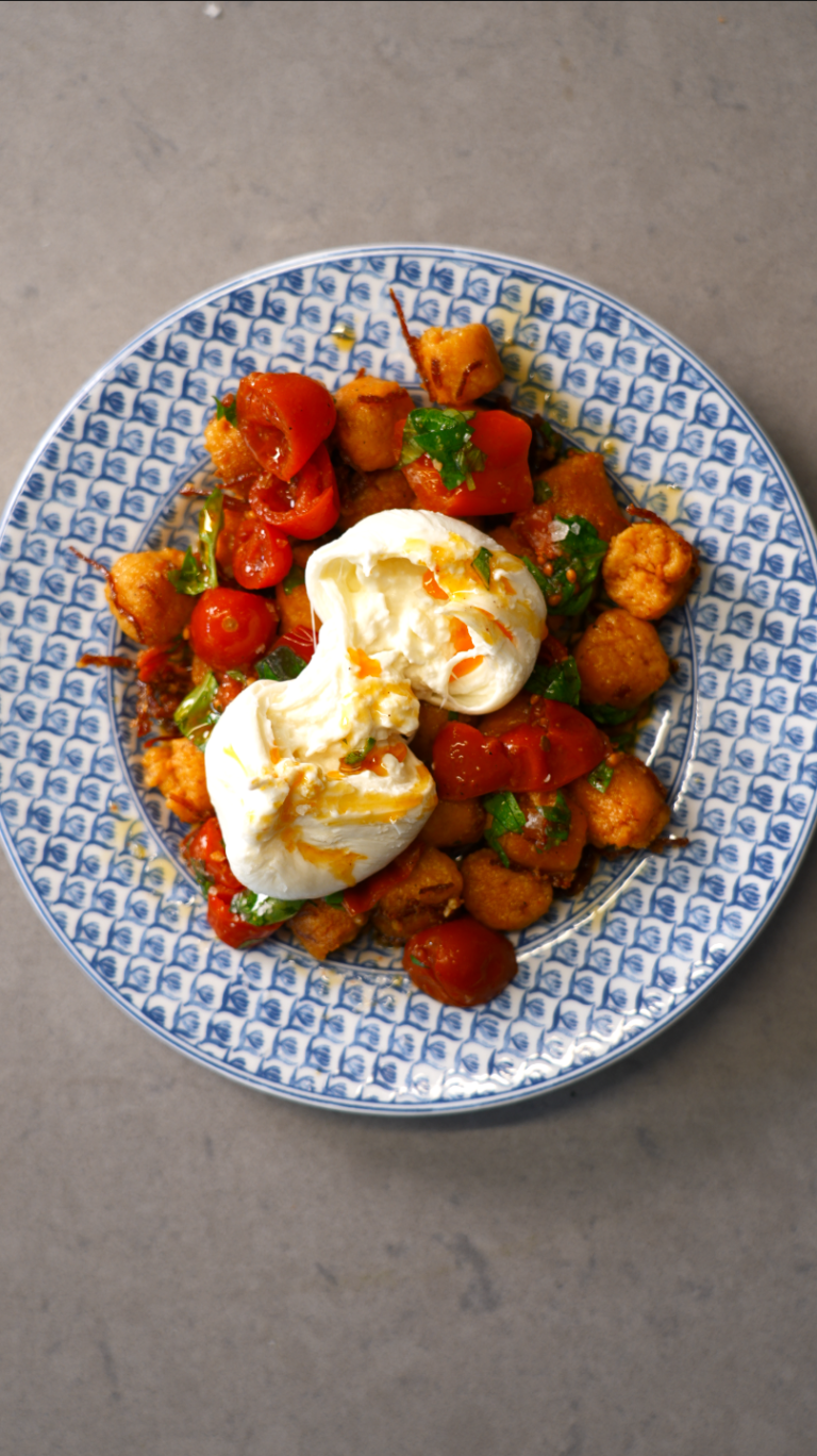 This is classic pâte à choux style Parisian gnocchi. But with the flour reduced and replaced with finely ground pizza. It is crispy on the outside, tender inside, and tastes like pizza without being gimmicky.