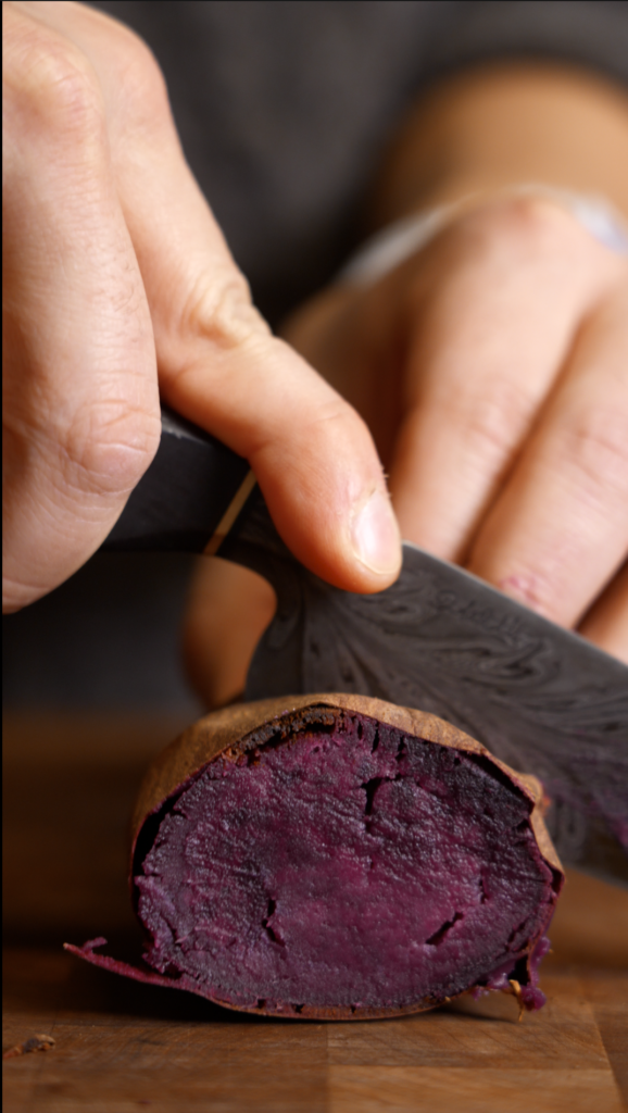 First, these are Japanese purple sweet potatoes, not ube. They are often confused, but they are very different. Purple sweet potatoes are mildly sweet, nutty, and starchy. Ube is a different root entirely and is rarely found fresh in the US.