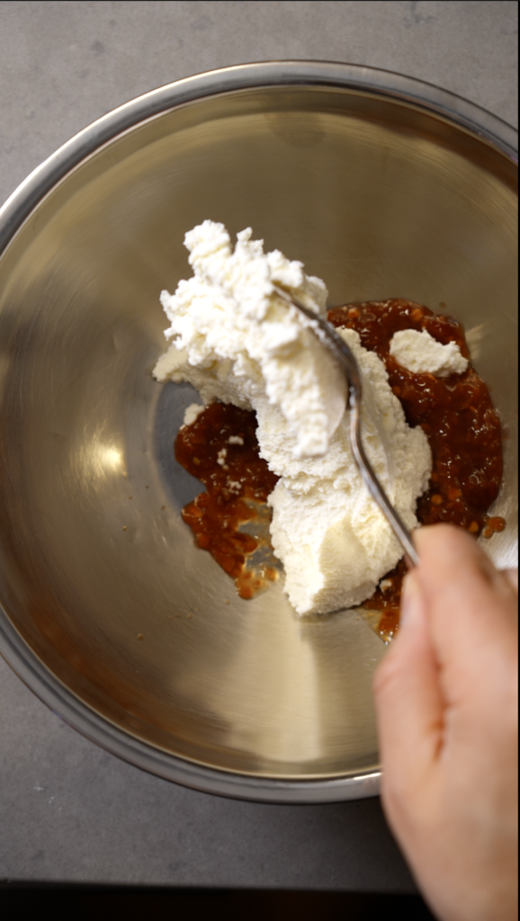 - In a bowl, whisk together the ricotta and sambal until light and creamy. Season with lemon juice and salt to taste.