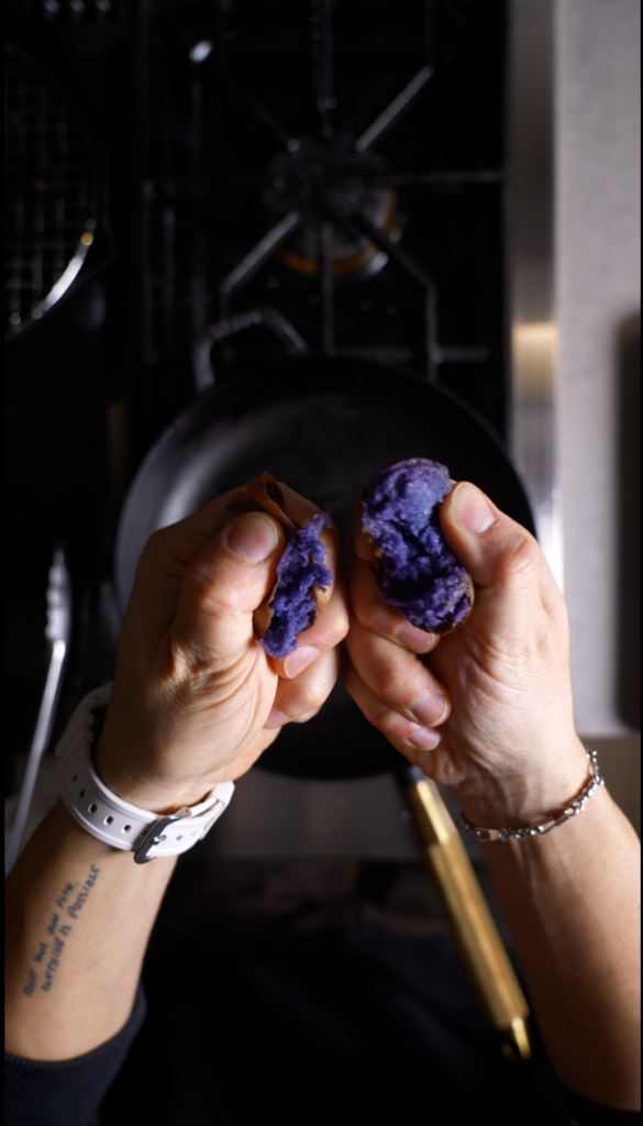- Break cooked baby potatoes into chunks and sauté in hot oil until deeply golden and crispy. Toss with black sesame paste and salt while hot.
