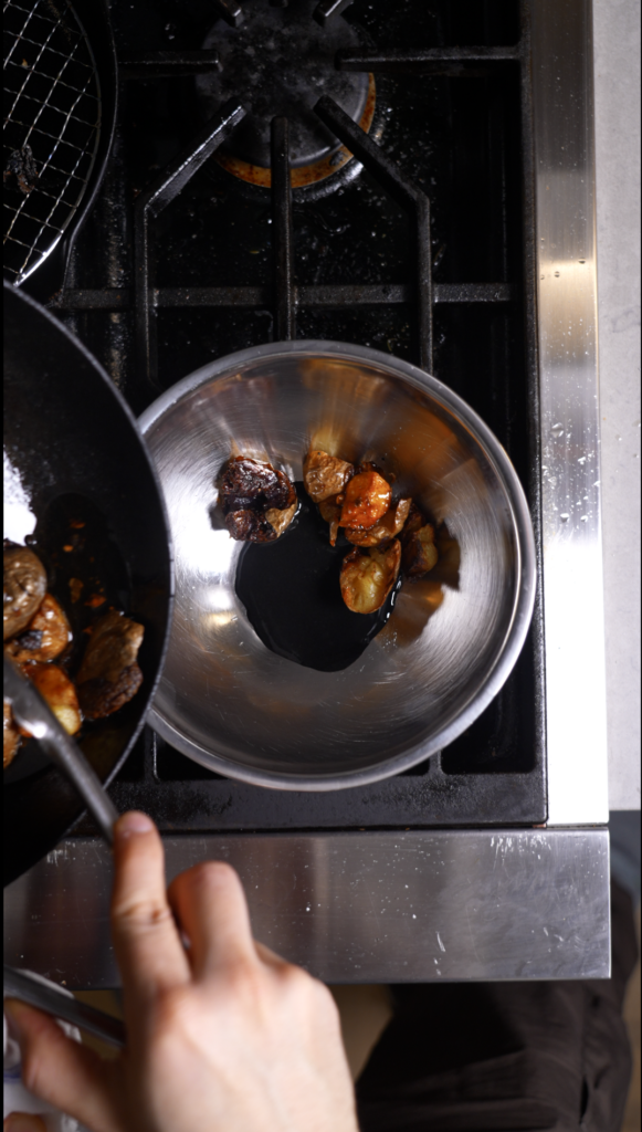 If you think about it, this is basically fish and chips. Just… my version. Roasted smelt instead of fried fish, crispy potatoes dressed in black sesame instead of fries, and a romesco that pulls everything together. It eats like bar food, but it plates like something you would get at a restaurant. Cozy, salty, acidic, crunchy, and honestly very fun to eat.