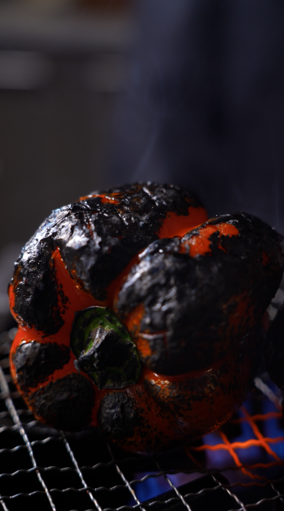 Roast the Peppers for the Romesco: Place the image of the charred red bell peppers over the flame here.