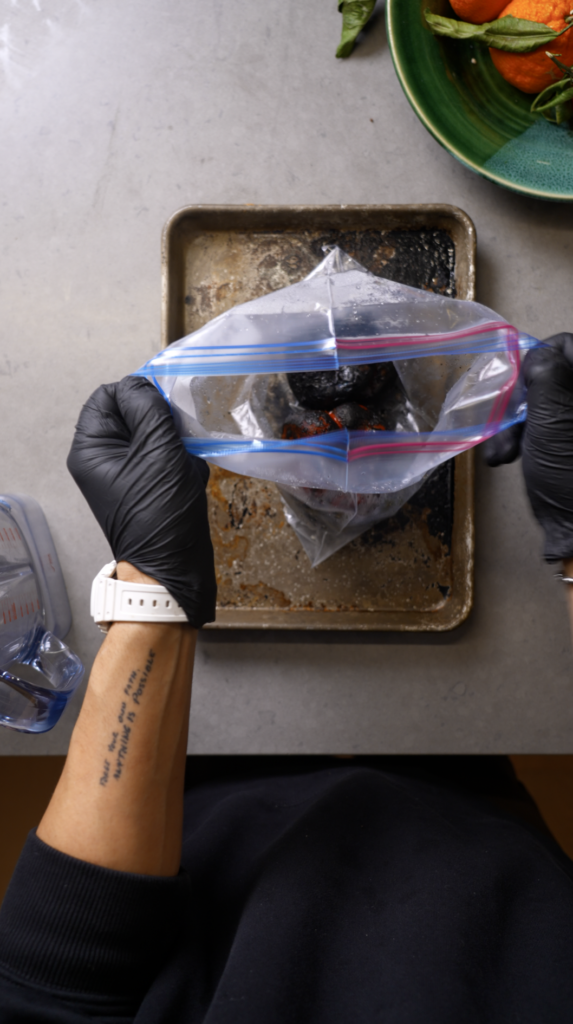 Roast the red bell peppers directly over a flame or under a broiler until fully charred on all sides. Once they are blackened, place them into a plastic bag or zip top bag, seal it, and let them steam on the counter for 5 to 10 minutes.