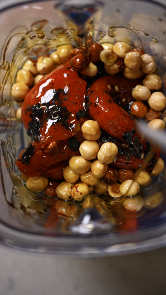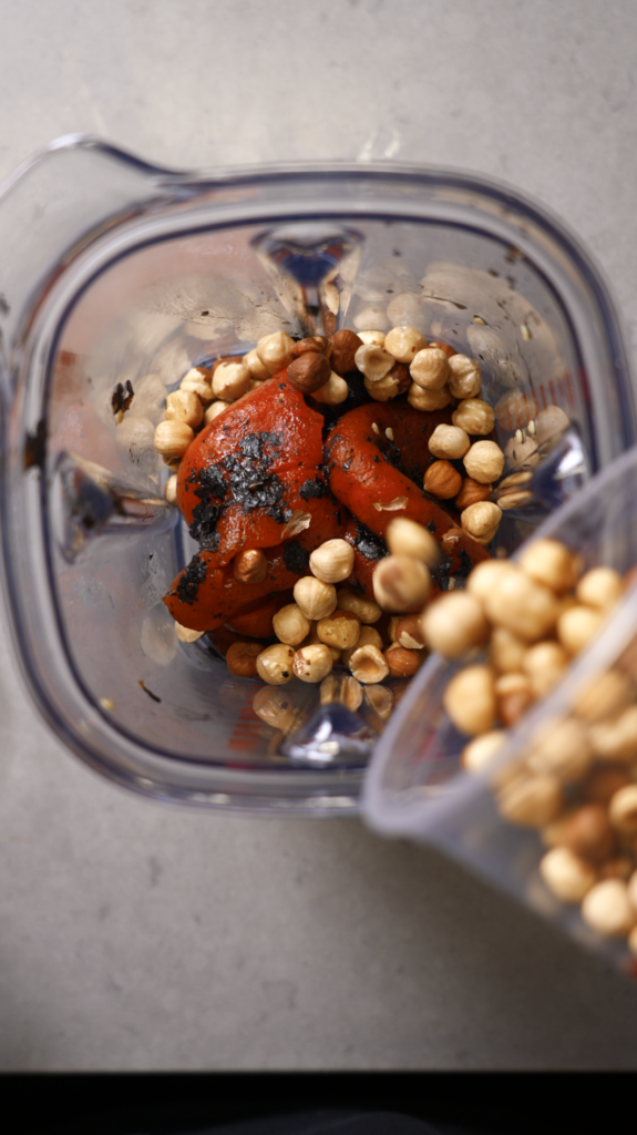 Build the Romesco: Place the blender image with peppers and hazelnuts here.