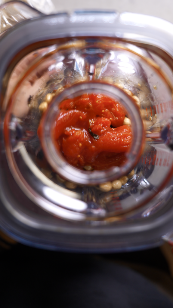 Add the roasted peppers to a blender along with the hazelnuts, San Marzano tomatoes, garlic powder, paprika, and a good pour of olive oil. Blend until smooth.