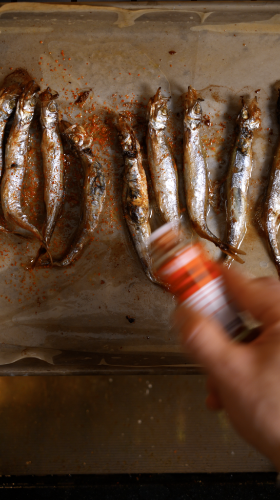 - Arrange smelt on a parchment-lined tray, drizzle with olive oil, and season with salt. Roast at 420°F until browned and lightly charred. Finish with togarashi or chili flakes.