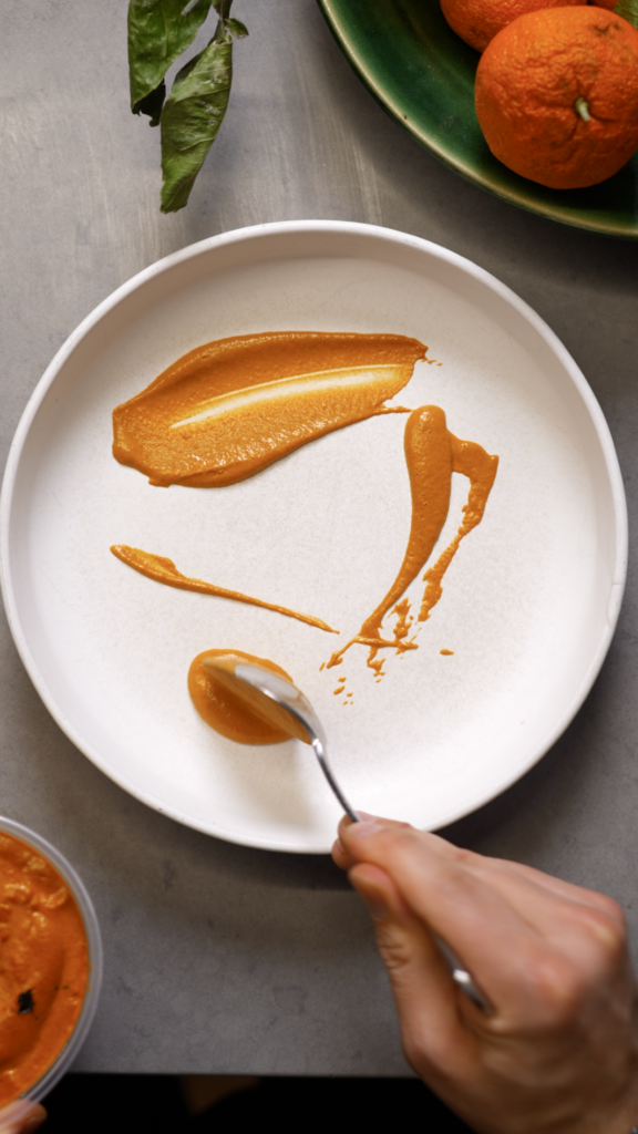 Plate the Dish: Swipe romesco onto the plate.