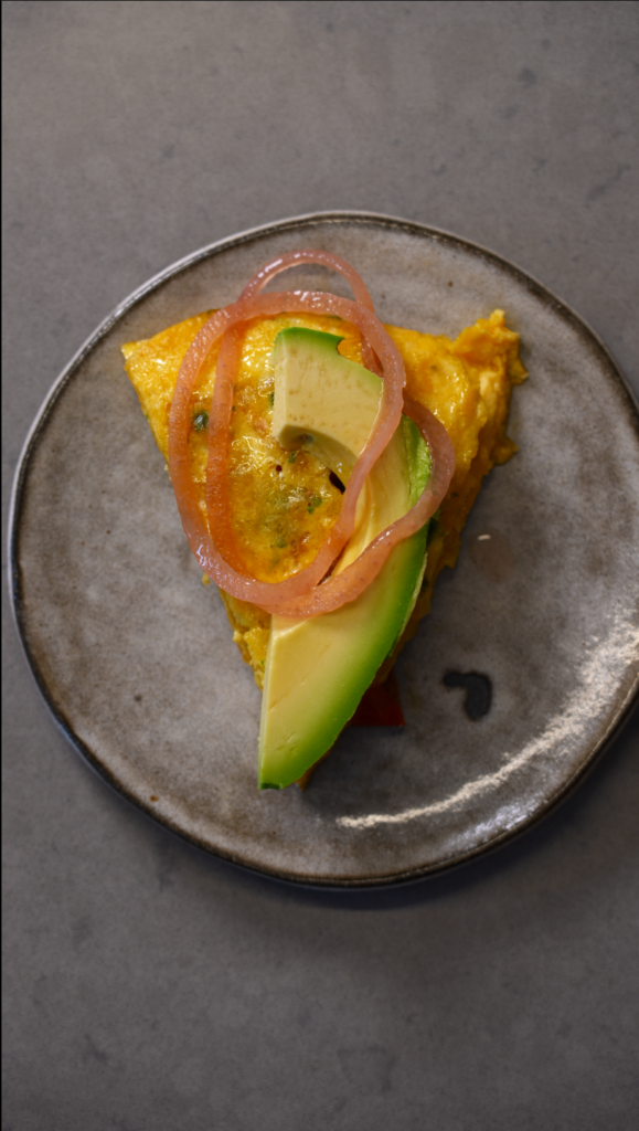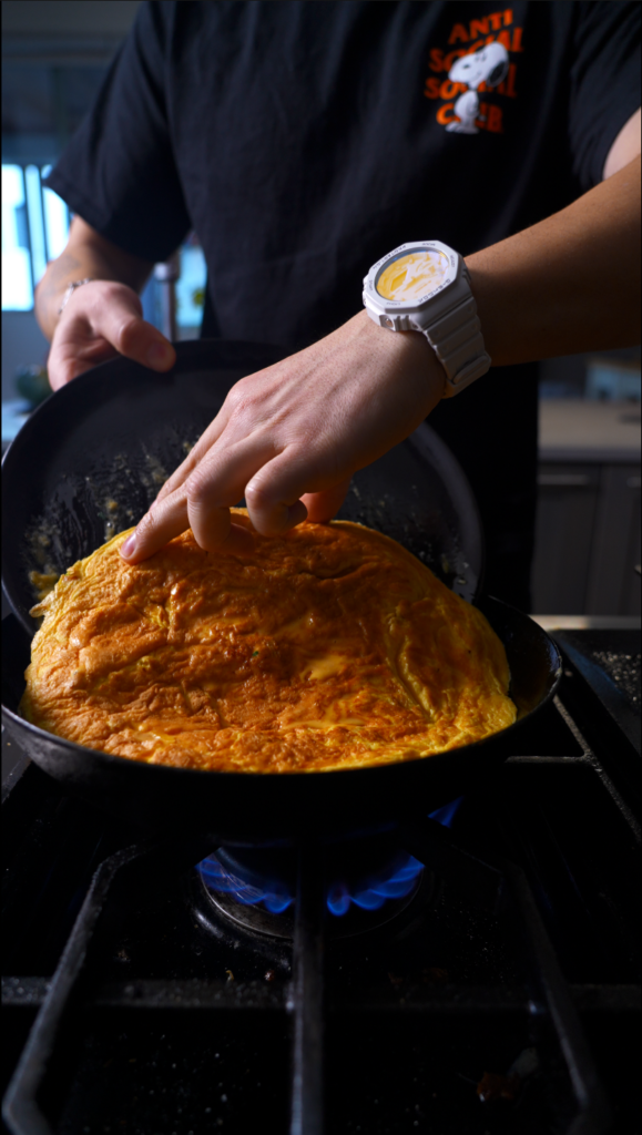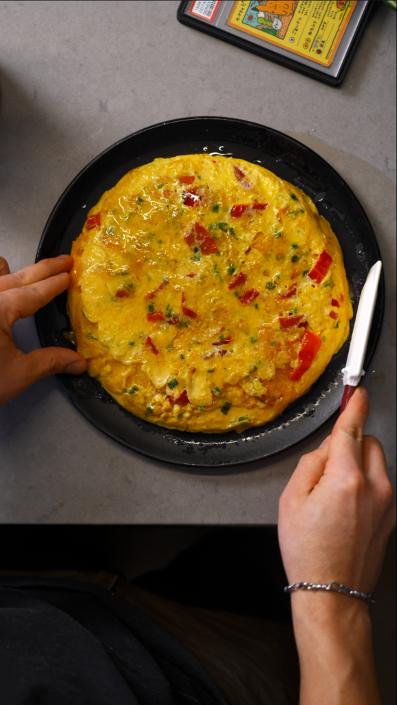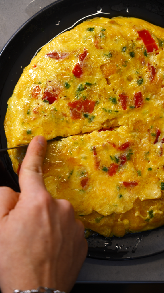 A Spanish tortilla is closer to a frittata, but softer. It is cooked low and slow in olive oil. The eggs should never scramble. The middle should stay jammy and custardy. In Spain, it is often served at room temperature or straight from the fridge, sliced like a cake.
