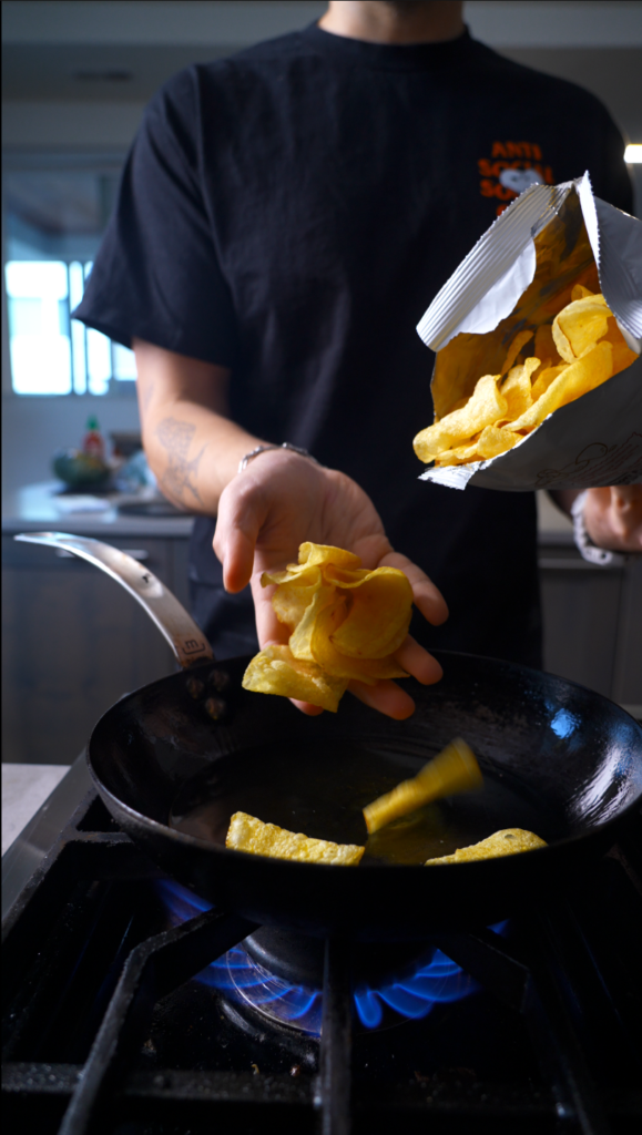 Fast forward to recently. I saw that Chef José Andrés has his own Spanish olive oil potato chips. That instantly clicked something in my head. Spanish chef. Spanish chips. Spanish tortilla. Potato chips are already fried potatoes. They are basically halfway to confit. Why not lean into that?