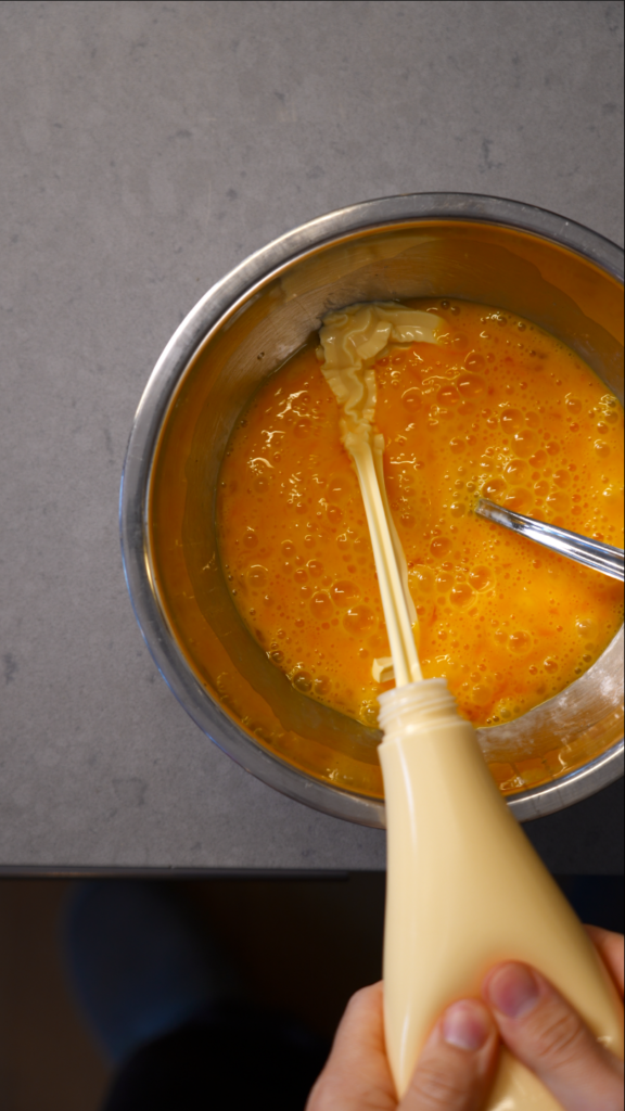 Prepare the Egg Base: Crack the eggs into a large bowl. Add the mayo and salt. Whisk until fully combined and smooth. The mayo adds richness and helps create that custardy texture without overcooking.