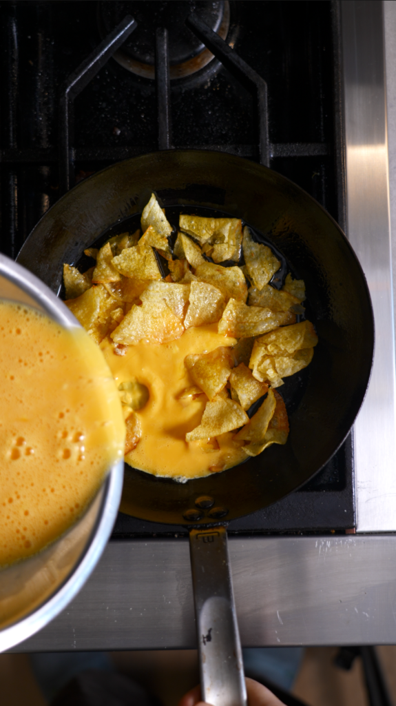 - Add potato chips, then pour in egg mixture (pan should not be hot).