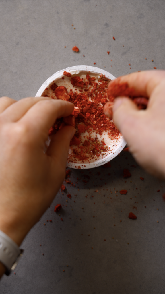 Crush the dehydrated strawberries with your hands. Sprinkle both evenly over the yogurt.