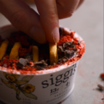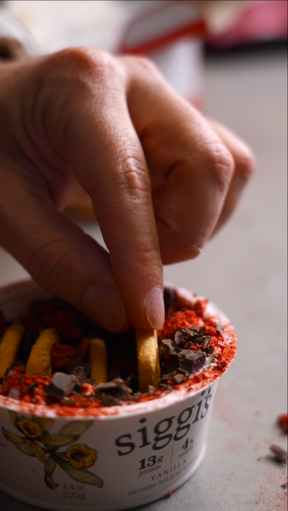 For this version, I used Siggi’s vanilla skyr. I usually go zero sugar, but the vanilla works really well here and keeps it feeling like dessert without going overboard.